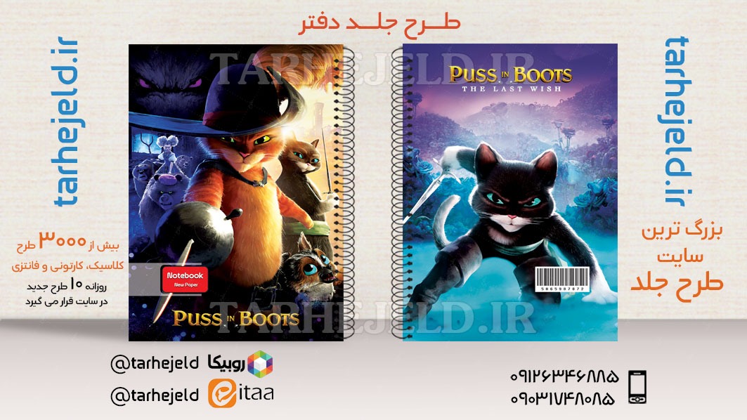 طرح لایه باز جلد دفتر گربه چکمه پوش کد03589
